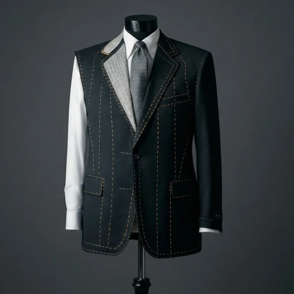 Hand-Finished Artistry: Every buttonhole and lapel edge features subtle, hand-stitched pick detailing—the true hallmark of a bespoke garment.